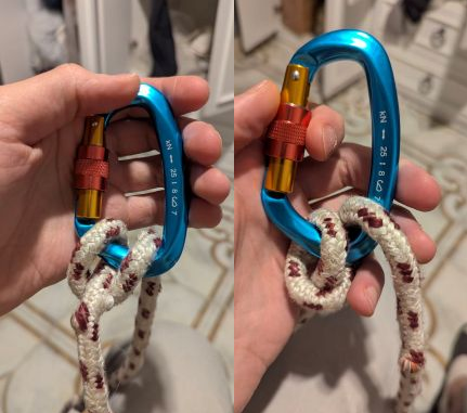 Вместо двойного можно использовать супер-УИАА. Он проще вяжется, при этом суть его не меняется. Второй виток тут получается за счёт карабина. Ну и тоже следите, чтобы верёвка не раскручивала карабин.